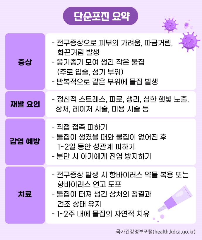 안녕하세요! 건강지킴이입니다 ✨ 피곤할 때마다 입술에 작은 물집들이 옹기종기 모여서 생기는 경험, 한 번쯤은 있으시죠? 혹은 성기나 엉덩이 부위에 반복적으로 물집이 생겨서 고민이신 분들도 계실 거예요. 이런 증상이 나타난다면 '단순포진'을 의심해보셔야 해요! 오늘은 많은 분들이 겪고 있지만 정확히 알지 못하는 단순포진에 대해 자세히 알아보겠습니다 💪