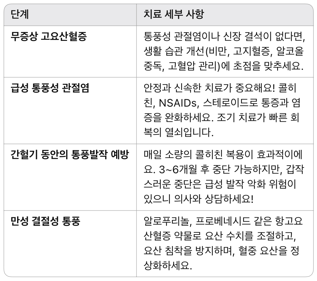 통풍 치료는 발작의 단계와 환자의 상태에 따라 다르게 접근해야 해요. 여러분을 위해 단계별 치료법을 정리했습니다!