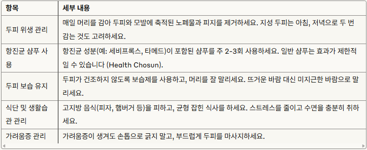 • 예방은 매일 머리 감기, 항진균 샴푸 사용, 두피 보습이 중요하며, 치료는 전문 샴푸와 피부과 상담으로 관리됩니다.