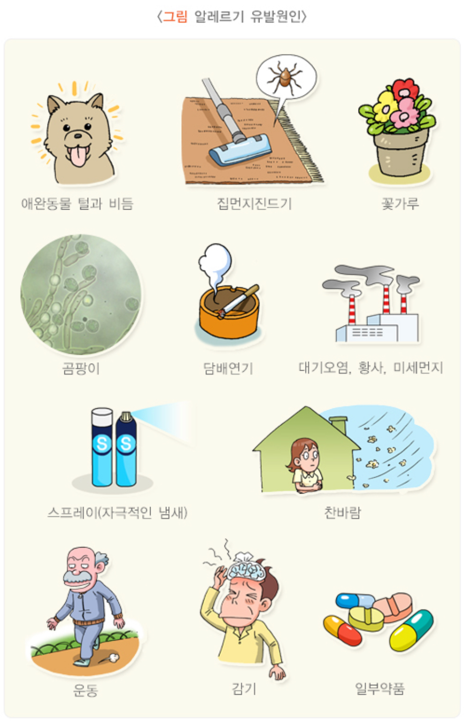 이런 물질을 알레르겐(allergen)이라 부르며, 대표적인 예시는 다음과 같습니다.